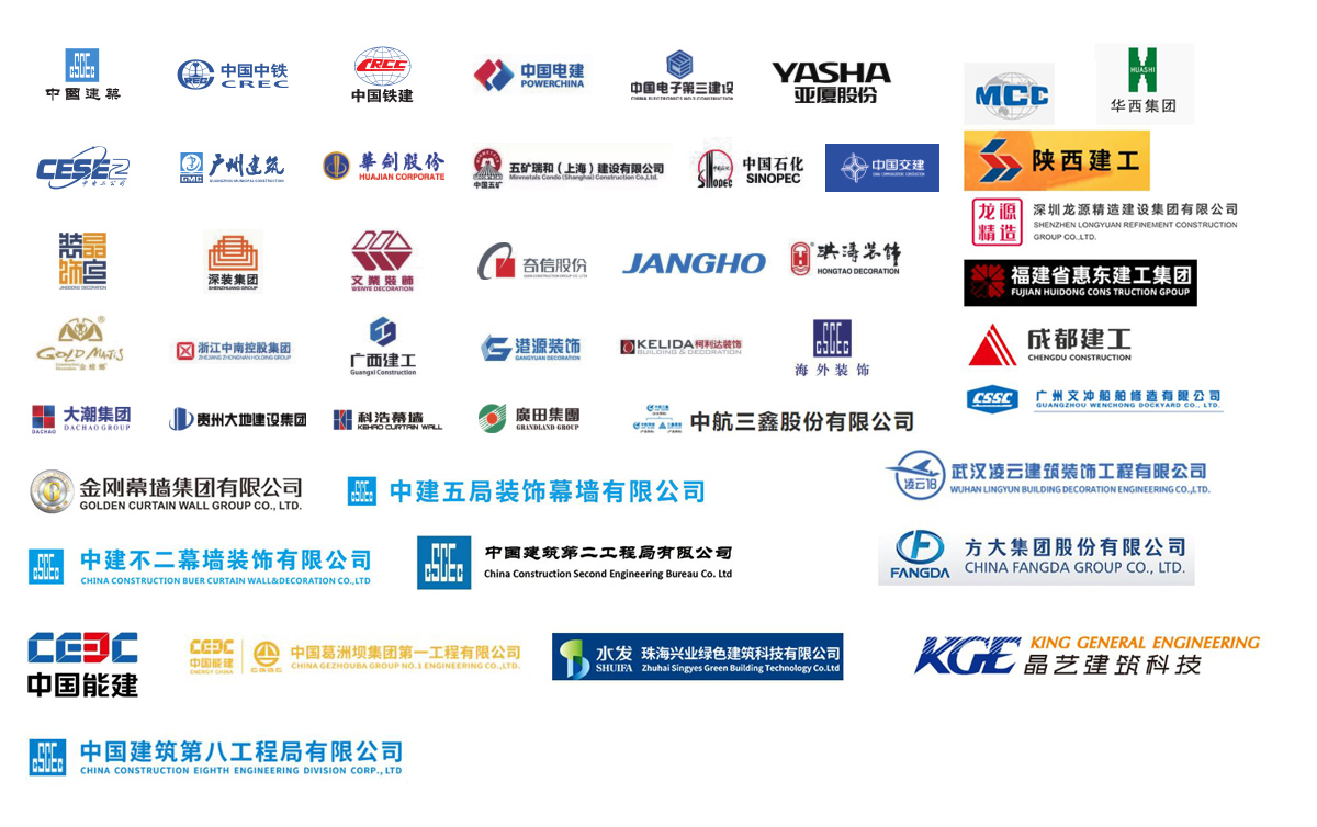 公司參建了諸多大型項目工程,如港珠澳大橋、珠海國際航展、深圳國際會展中心、廣州白云機(jī)場、西安全運會場館、成都東安湖大運會場館、樂山奧體中心、洛陽奧體中心、增城富士康廠房、惠州中海油、陽江核電站、珠三角各地鐵線、高鐵站、廣西桂林機(jī)場、廣西柳州文化廣場、四川成都天府機(jī)場、海南海口美蘭機(jī)場、西安絲路會展中心、惠州北站等等。與中國建筑、中國中鐵、中國鐵建、中國電建、中國交建、中國中冶、中國能建、廣東建筑、廣西建工、廣州建筑等大型國有企業(yè)下屬公司及江河幕墻、金螳螂裝飾等各大建筑裝飾、幕墻裝飾公司達(dá)成長期友好合作關(guān)系。